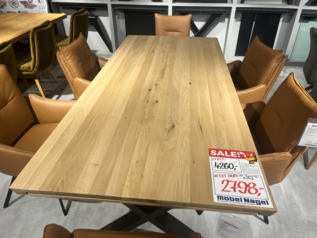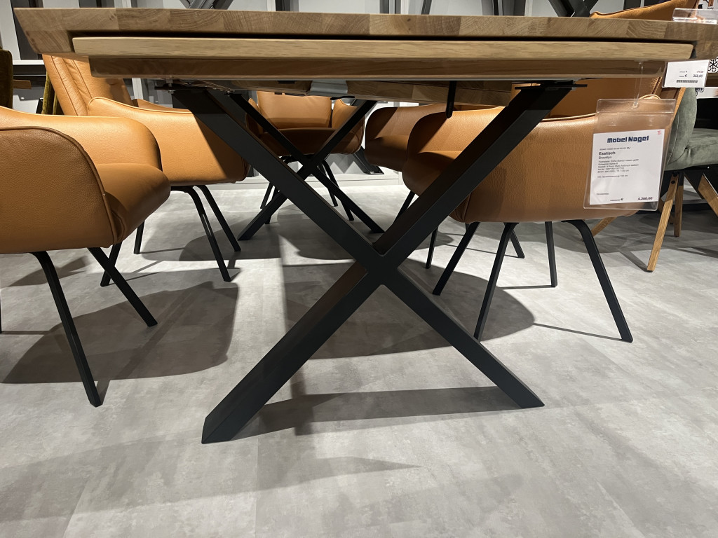 Tischplatte: Eiche Bianco massiv geölt Schweizer Kante BGestell: X-Form Stahl Anthrazit lackiertArt. Nr: 1007150/1007253B/H/T: 220 (320) / 73 / 100 cmInkl. Synchronauszug 100 cm