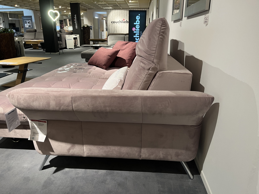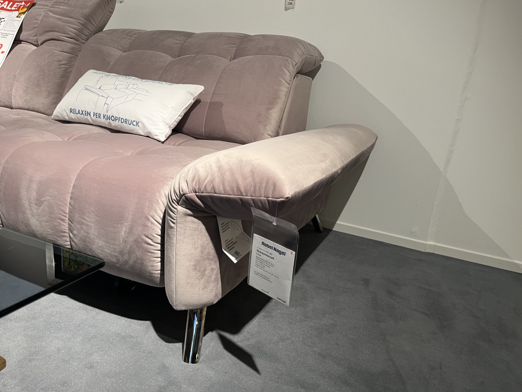 Bezug: Riviera flieder 62, SG 11Wohnlandschaft 5586_100_FKTFüße: Metall chromfarbig Sitz: Pur-SchaumSitzhöhe: 46 cmGröße: B/H/T 244-270 / 87-104 / 173 cminkl. Sitting Bed motorisch & Kopfteil- und Armteilverstellung
