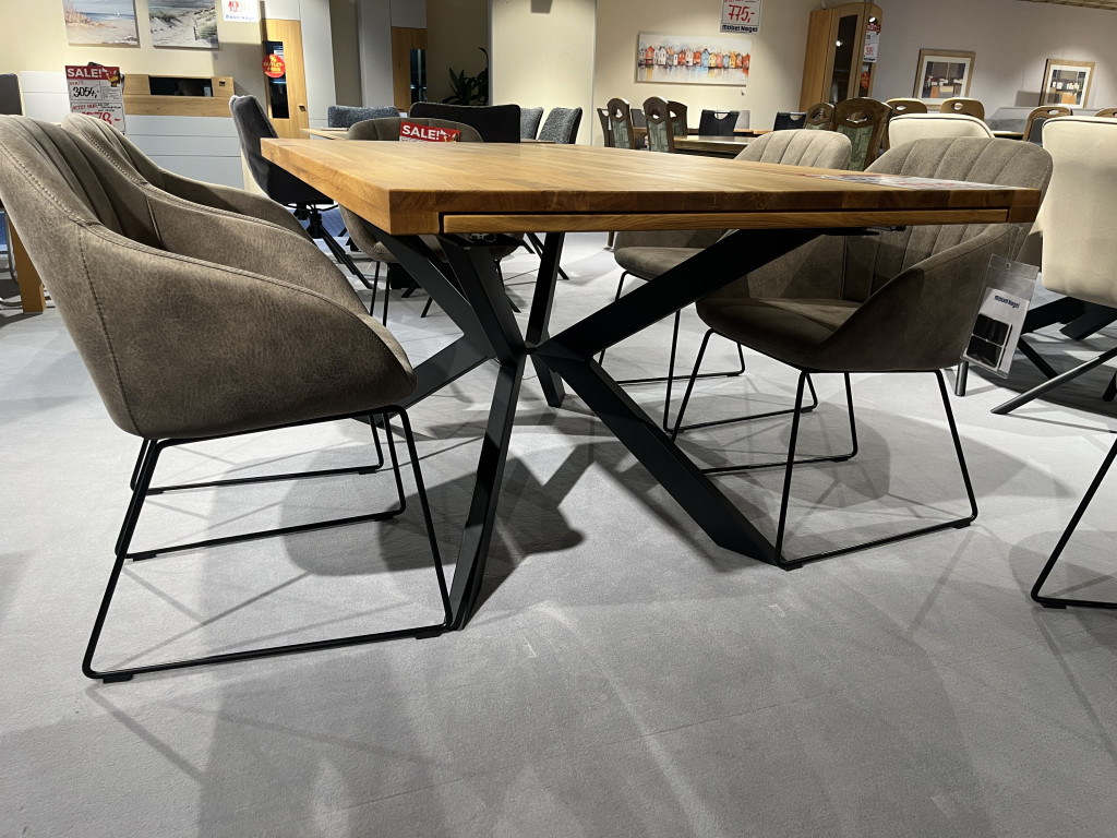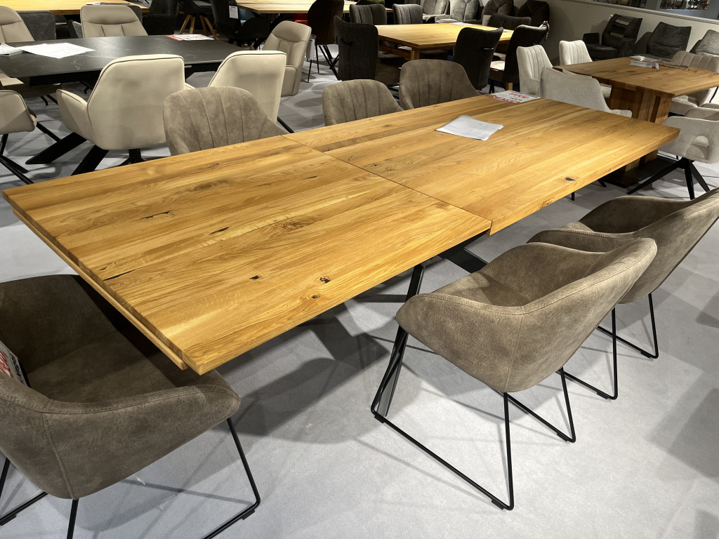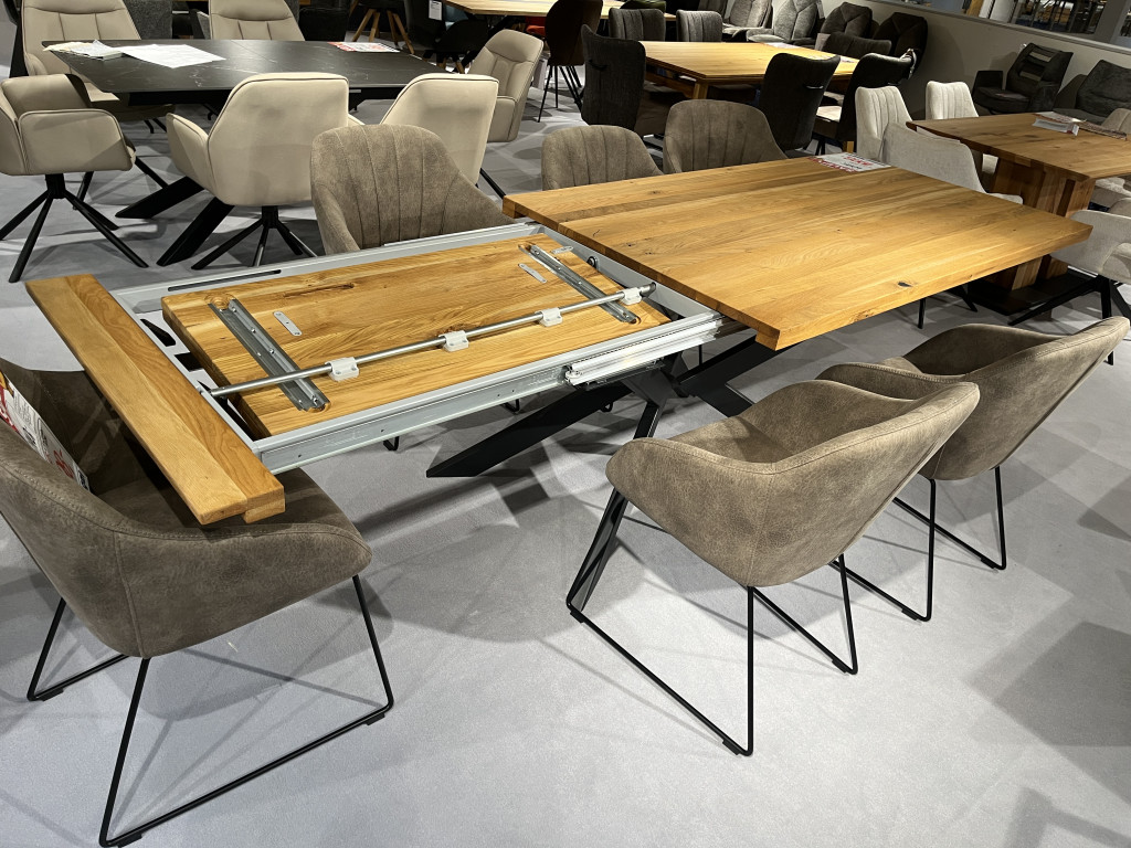 Holzart: Wildeiche geölt Gestell: Metall anthrazit gepulvertmit SynchronauszugArt.Nr: 1007516Größe: B/H/T 180 (280) / 77 / 100 cm