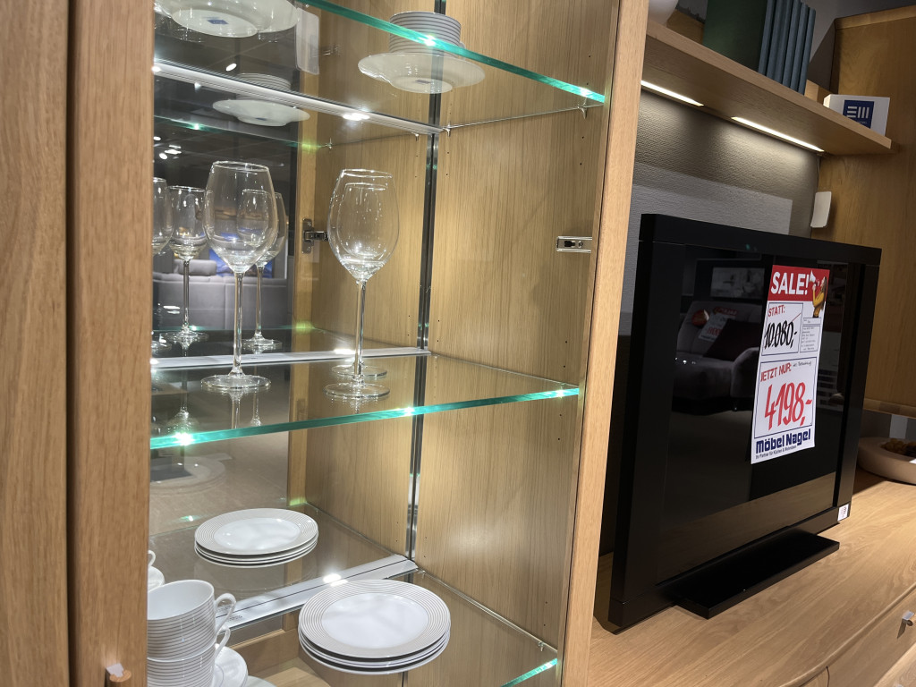 Wohnkombination FARO von EM PLANOSHolzart: Eiche sand teilmassiv PG 2Wohnvorschlag Nr. 71580Griff: G4Rahmenfarbe: Eiche sandB/H/T: 345 / 218,7 /49,7 cmInkl.2x Spiegelrückwand und allen Beleuchtungen