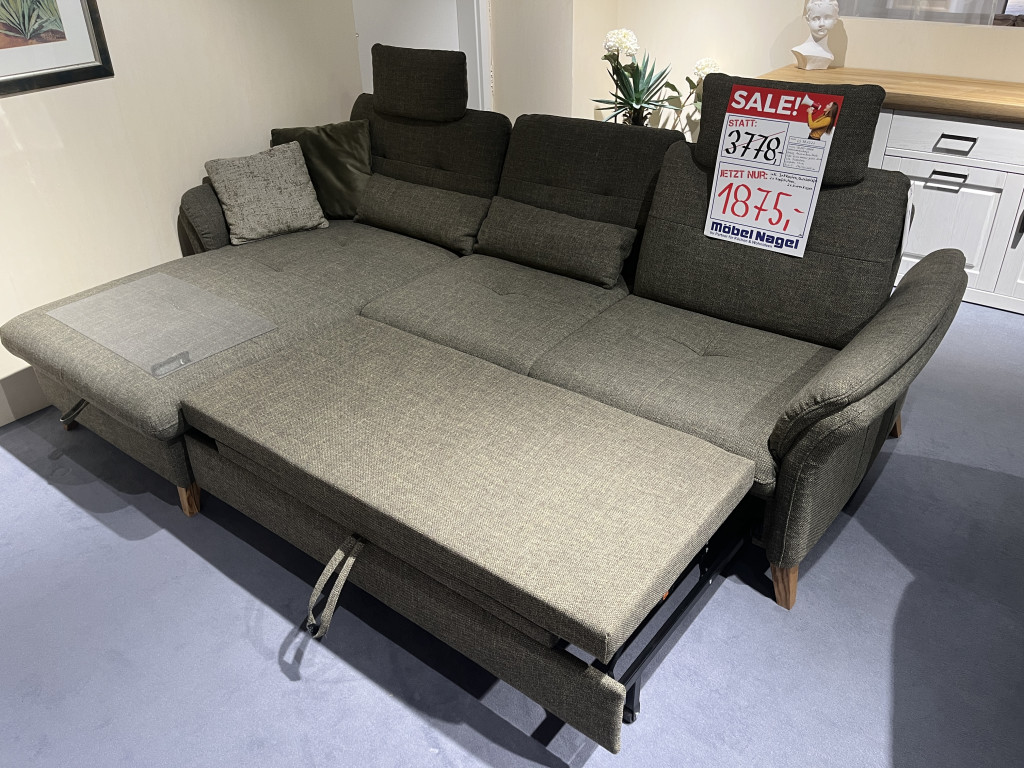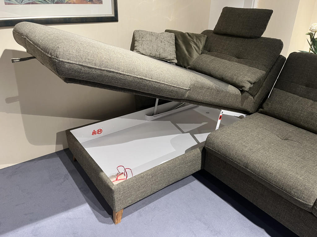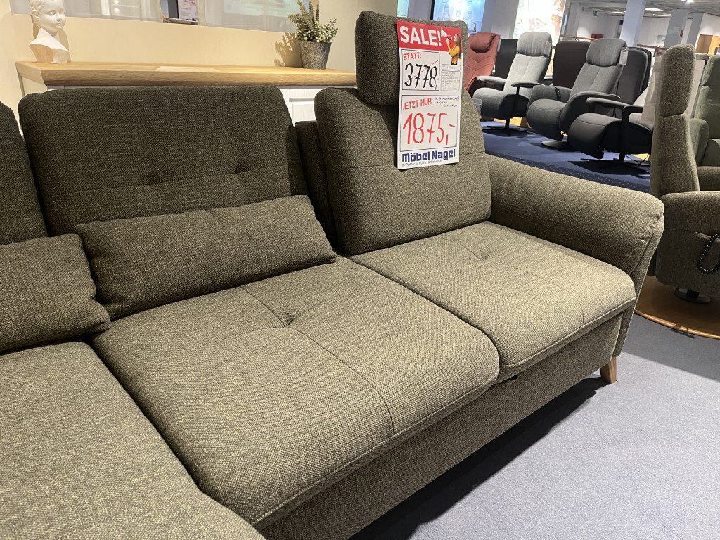 Bezug: Amsterdam khaki 757 PG: DWohnlandschaft 7280_FKTFüße: Eiche massiv geölt 12 cmSitz: FederkernSitzhöhe: 47 cmB/H/T: 176 / 90 / 268 cminkl. Bettkasten, Querschläfer, 2x Kopfstützenund 2x Nierenkissen