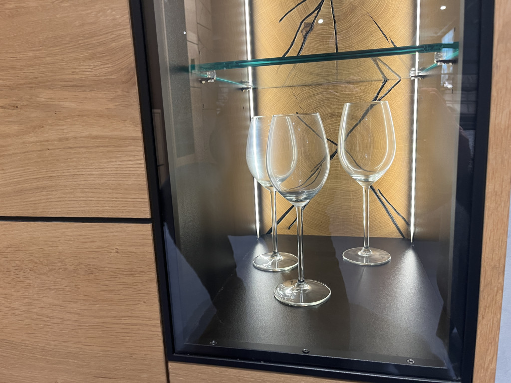 Korpus: Wildeiche furniertFront: Wildeiche furniertmit HirnholzapplikationHighboard 27013Größe: B/H/T 87 / 130,5 / 42 cmInkl. LED-Beleuchtung mit Touchschalter und Dimmfunktion