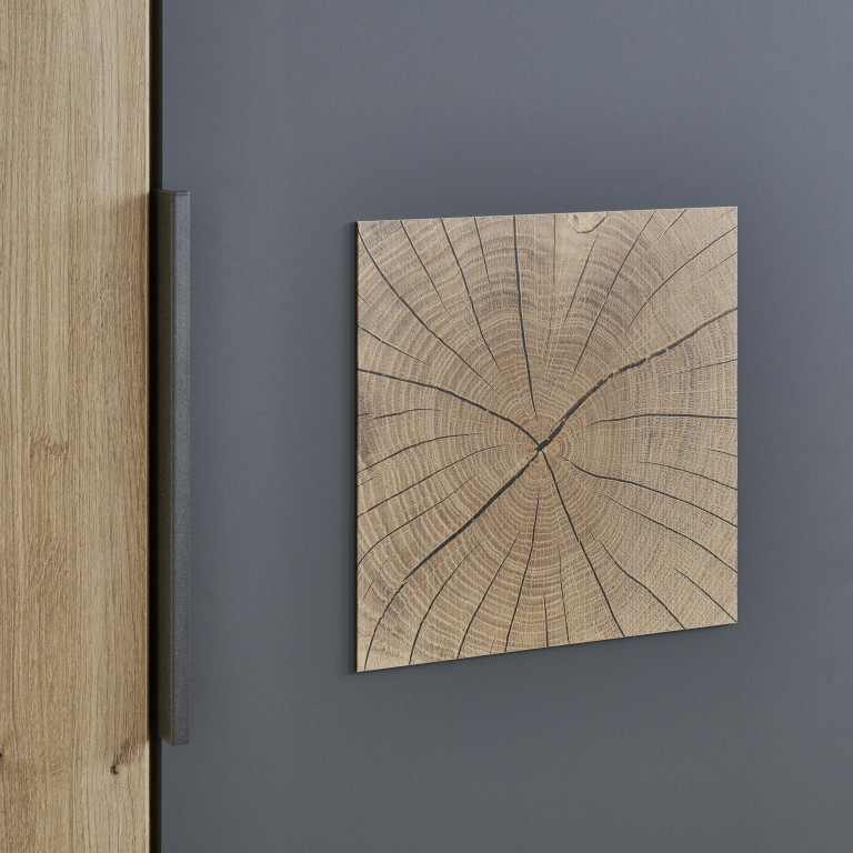 Drehtürenschrank, Korpus: Bianco Eiche Nachbildung, Front: Bianco Eiche Nachbildung/ Lava Dekor mit Hirnholz-Applikation,