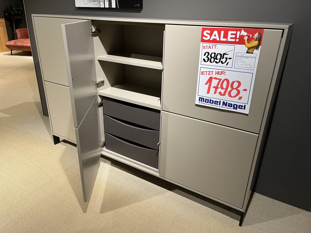 Lack cashmere PG 1 Linke/Rechte Mantelseite: Lack cashmereFüße: schwarzHighboard Nr. 68096B/H/T: 183,2 / 129,5 / 39,6 cminkl. 3er-Set Innenschubkästen