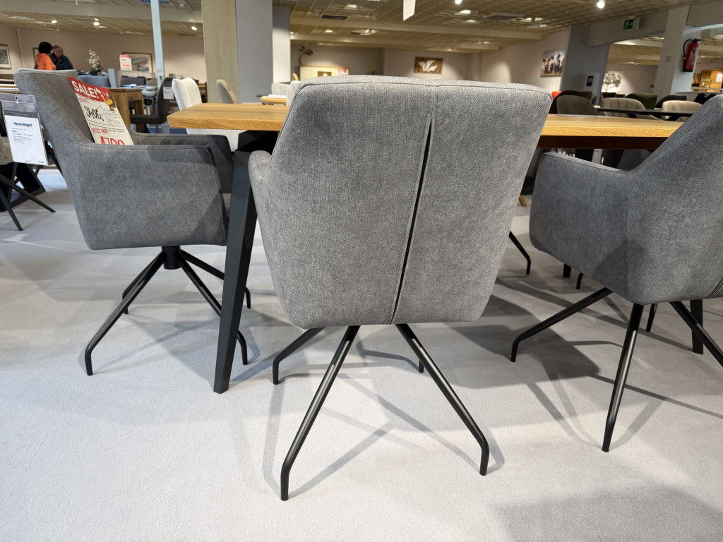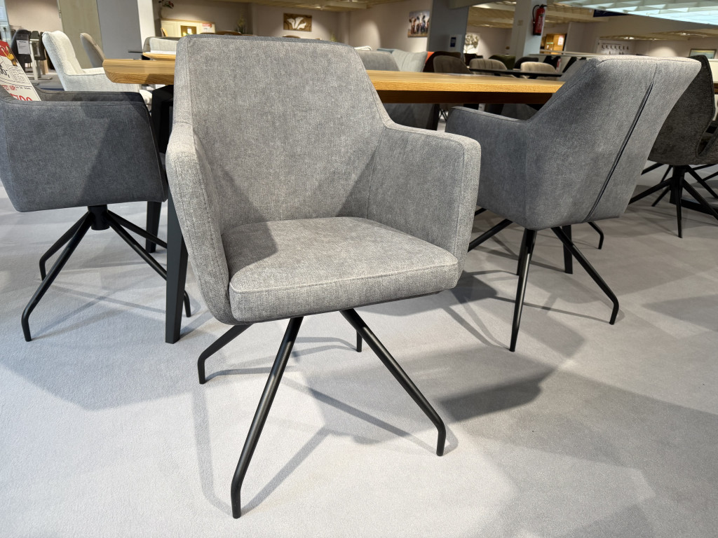 Bezug: Cara 5610 hellgrauStuhl T58AGestell: Metall schwarz (rund)Sitzhöhe: 49 cmB/H/T: 57 / 87 / 59 cm2x 180 Grad drehbares Untergestell4x festes Untergestell